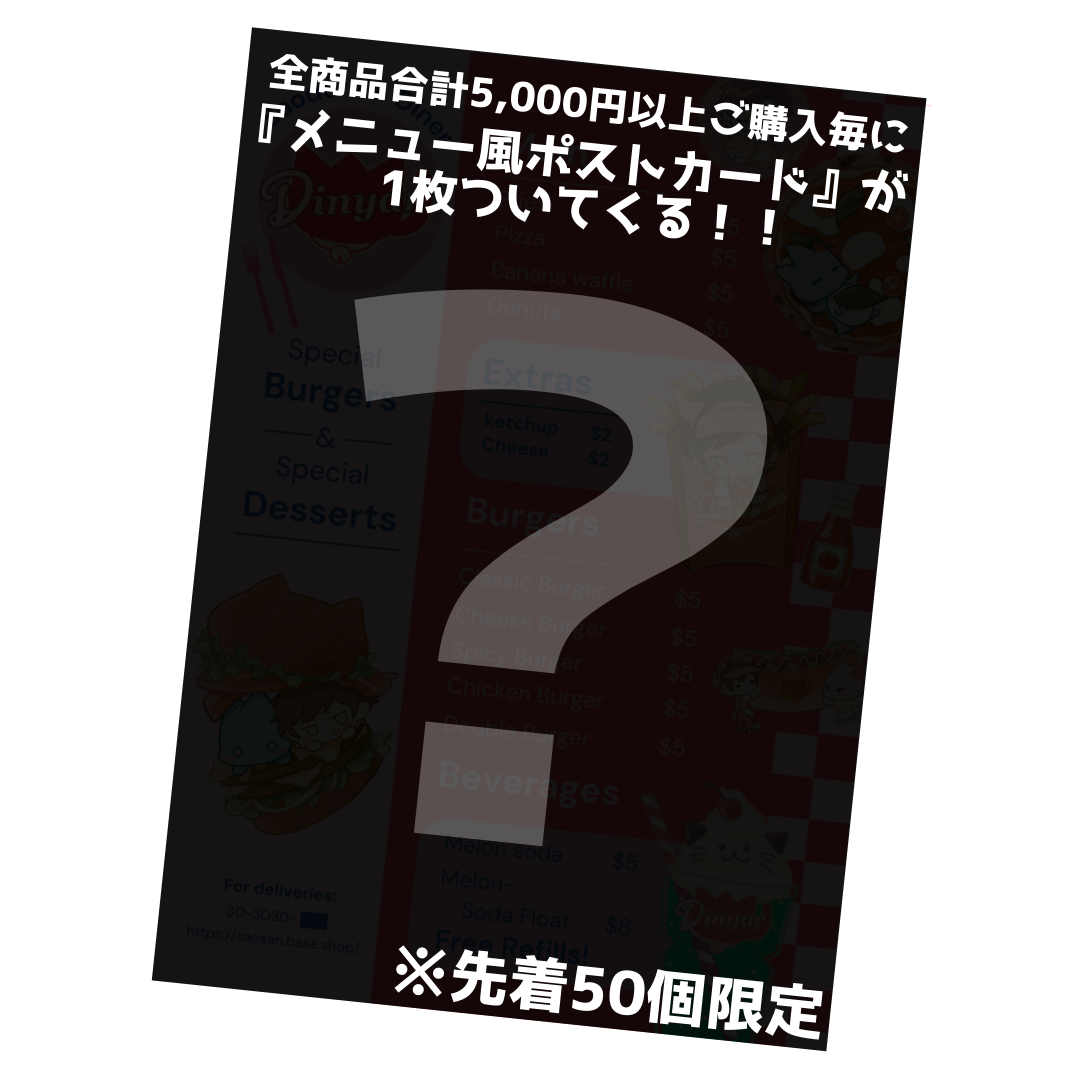 全商品の合計5000円ごとの購入でノベルティポストカードをプレゼント!ポストカードは全2種類のダイニャーのメニュー風になっています。※先着50枚限定
